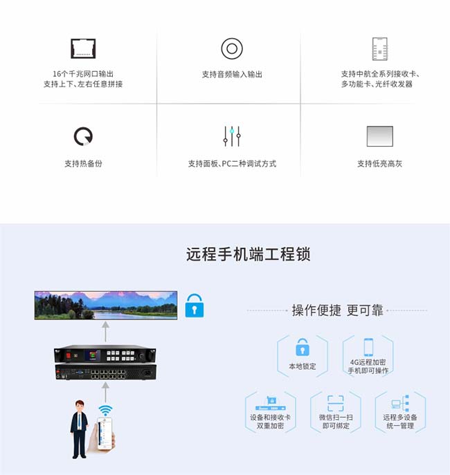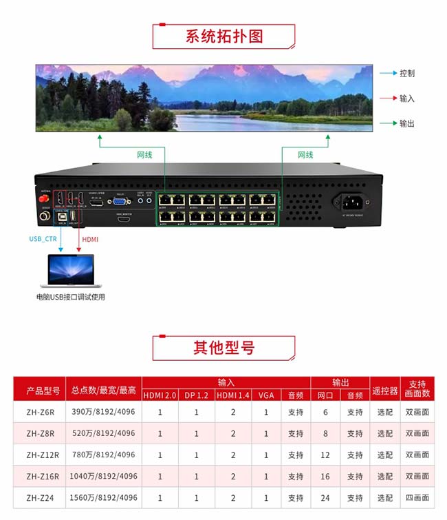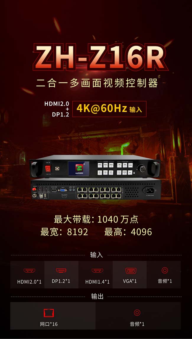 解決方案:ZH-Z16R十六網口4K多畫面二合一 + 戰狼接收卡,完美呈現。