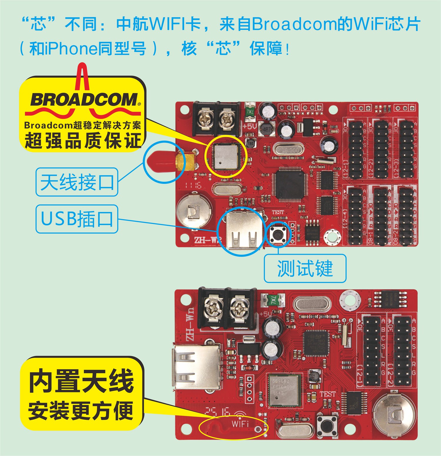 對于LED控制系統,一方面:WIFI卡就相當于一個無線路由器,打開手機WIFI找到控制卡發出的信號(ZH-W開頭的WIFI信號)連接,再進入操作軟件LED魔寶操作;另一方面:WIFI芯片幾乎決定控制卡的信號強度、信號穩定性及長時間運行是否頻點漂移。