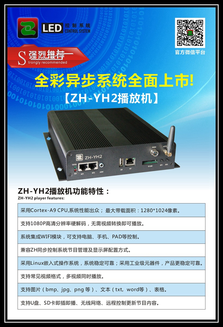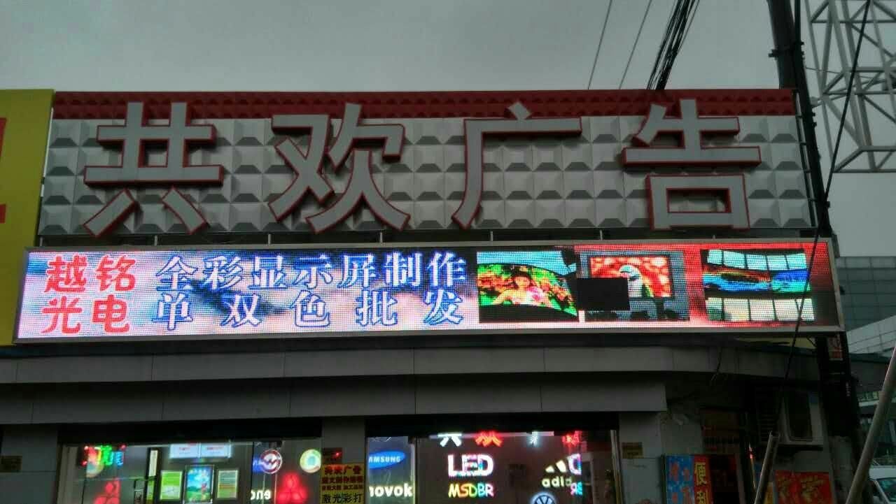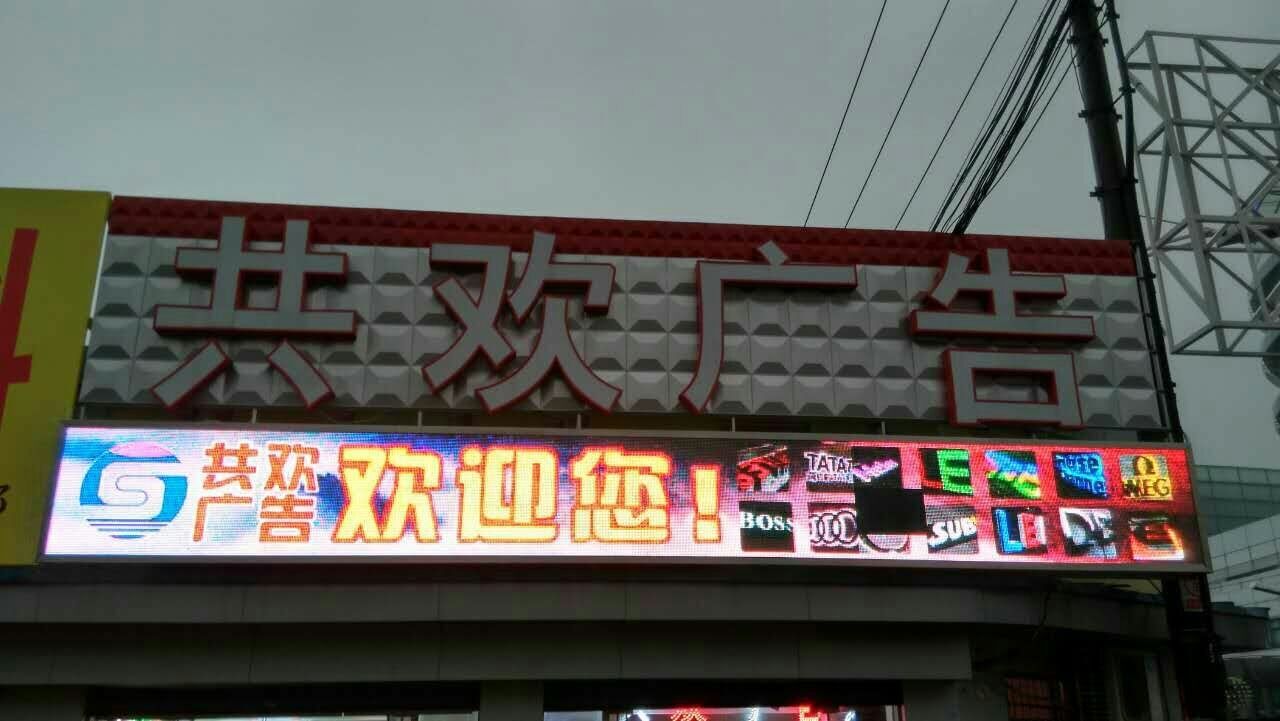 上海市共歡廣告P10門頭全彩768*80,1臺ZH-YH2播放盒(最大帶載1280*1024),3張ZH-CR75-12接收卡,中航異步全彩播放盒支持1080P高清解碼,無線WIFI,U盤,網線,SD卡等控制,播放流暢,無卡頓現象。做彩屏,用中航全彩系統!