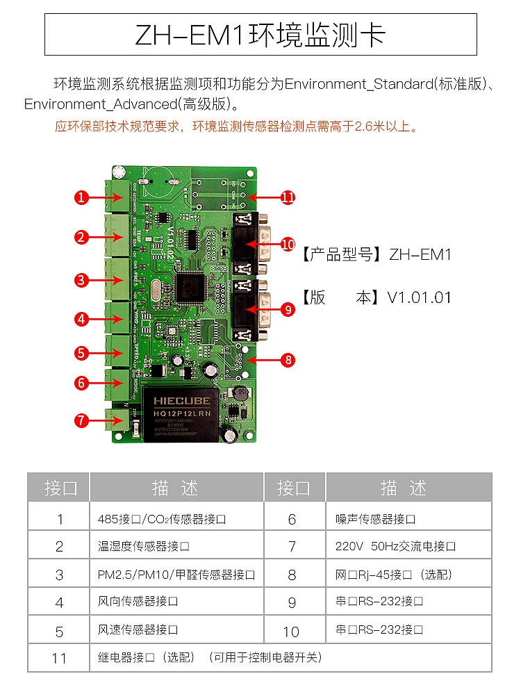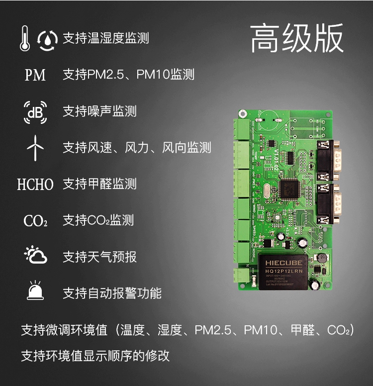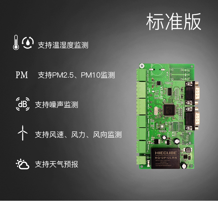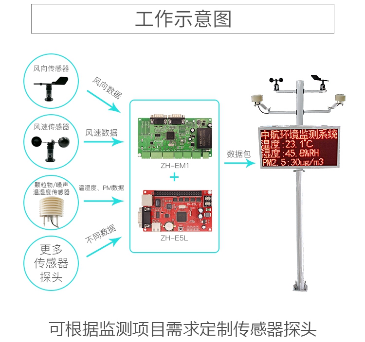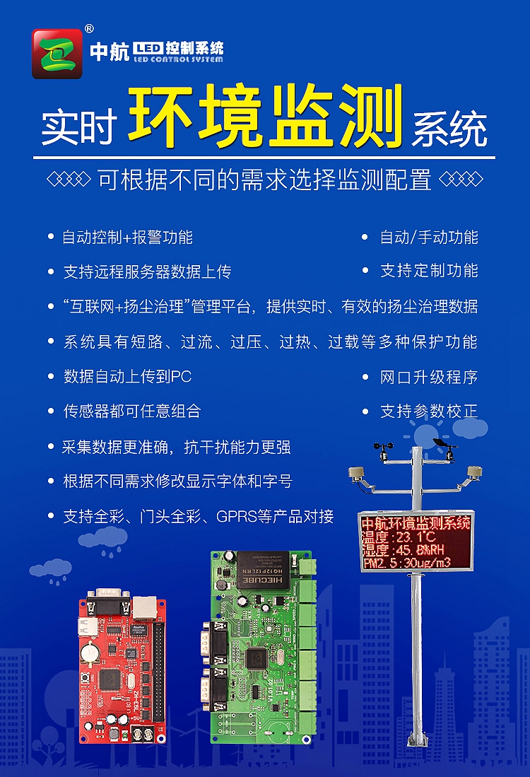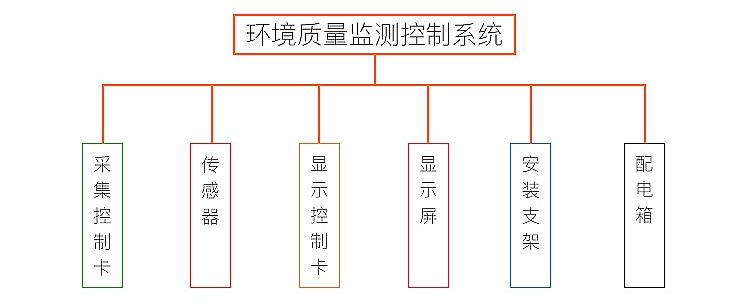 環境質量監測控制系統包括采集控制卡、傳感器、顯示控制卡、顯示屏、安裝支架、配電箱六個部分組成。