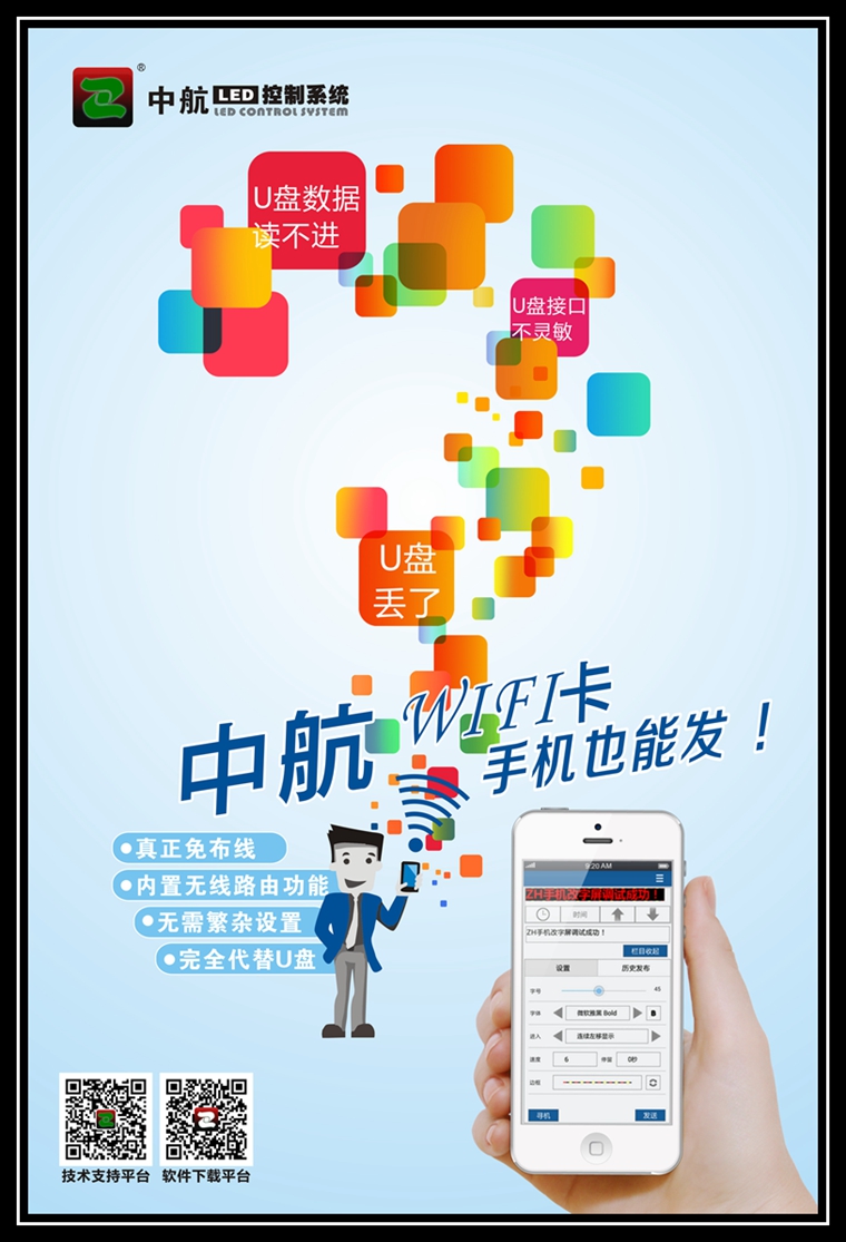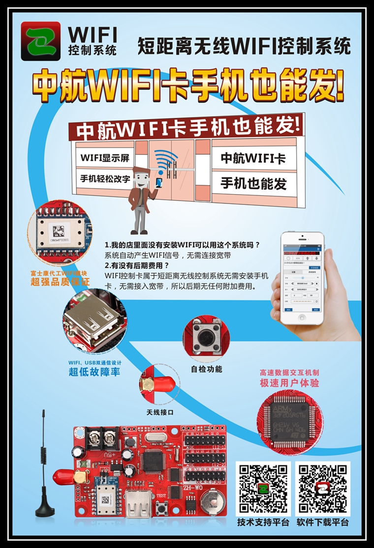 我公司推出V3版WiFi控制系統(tǒng),軟件操作簡(jiǎn)單好用,免布線、免U盤(pán)、無(wú)需連接寬帶,更無(wú)后期任何附加費(fèi)用,高質(zhì)量方案,更容易被行業(yè)人員所接受使用,我們相信中航無(wú)線WiFi控制系統(tǒng)正在創(chuàng)造另一個(gè)神話——無(wú)線WiFi控制卡取代U盤(pán)控制卡成為市場(chǎng)主流產(chǎn)品。