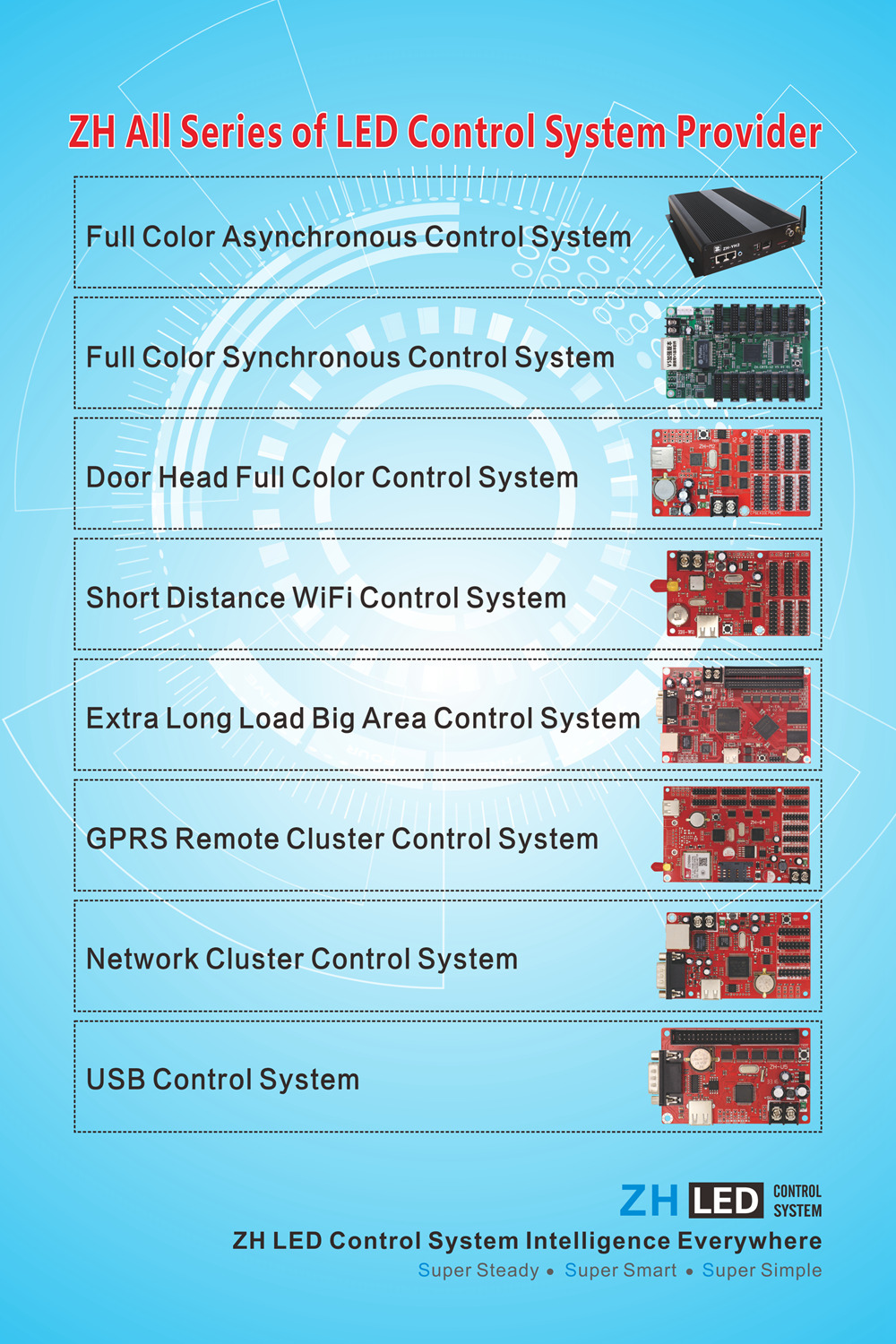 Exhibition:New V5, video processor, full color synchronous series, full color asynchronous series, doorhead full color (high and low ash) series, long with port network card, a comprehensive upgrade version of WIFI series, GPRS series, network card series and so on.